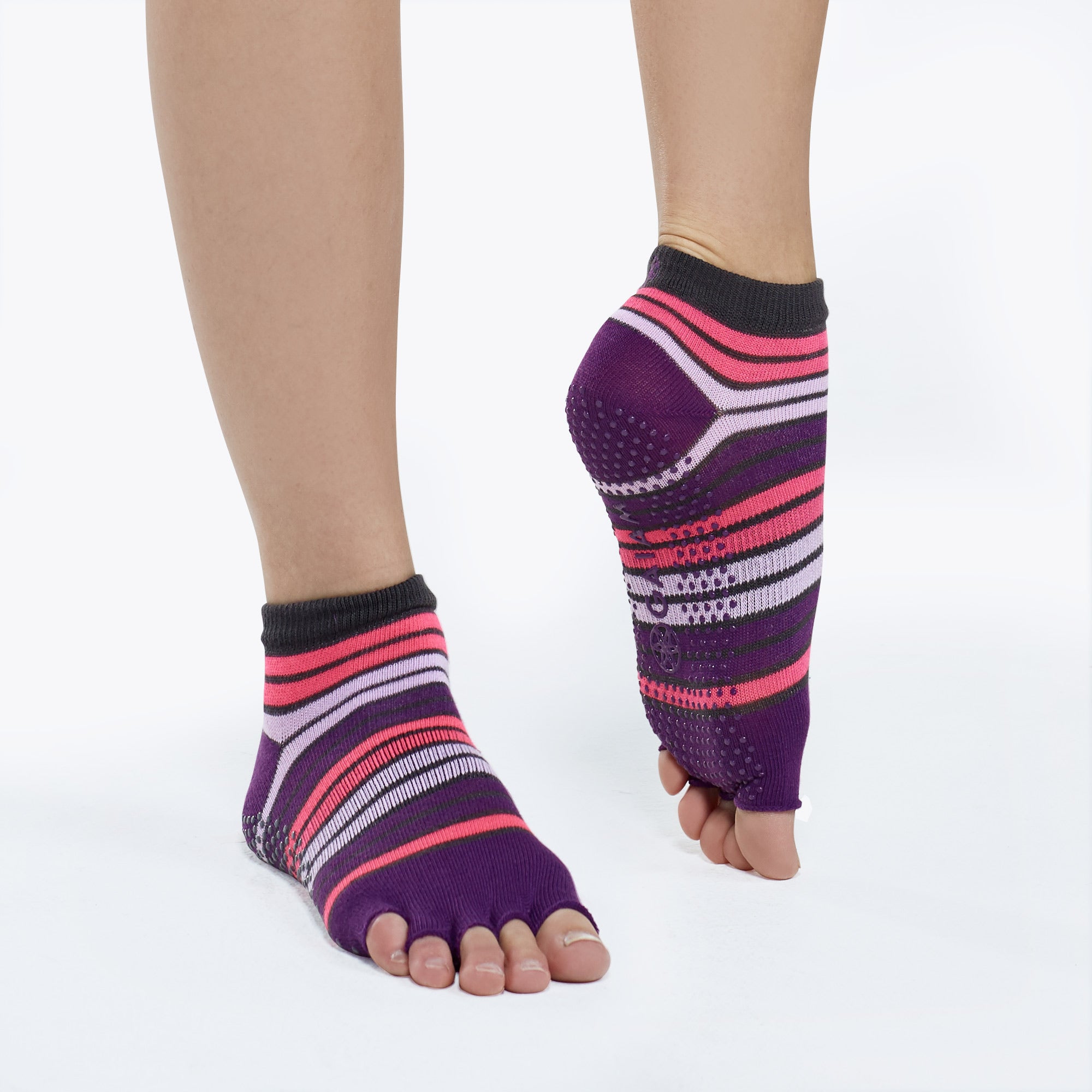 Take your yoga practice wherever you find yourself with these toeless Yoga Socks. The targeted traction zones provide no-slip grip on any surface, while the open design allows toes to spread naturally for better tactile feel and balance. Socks can be used with a mat for added grip.