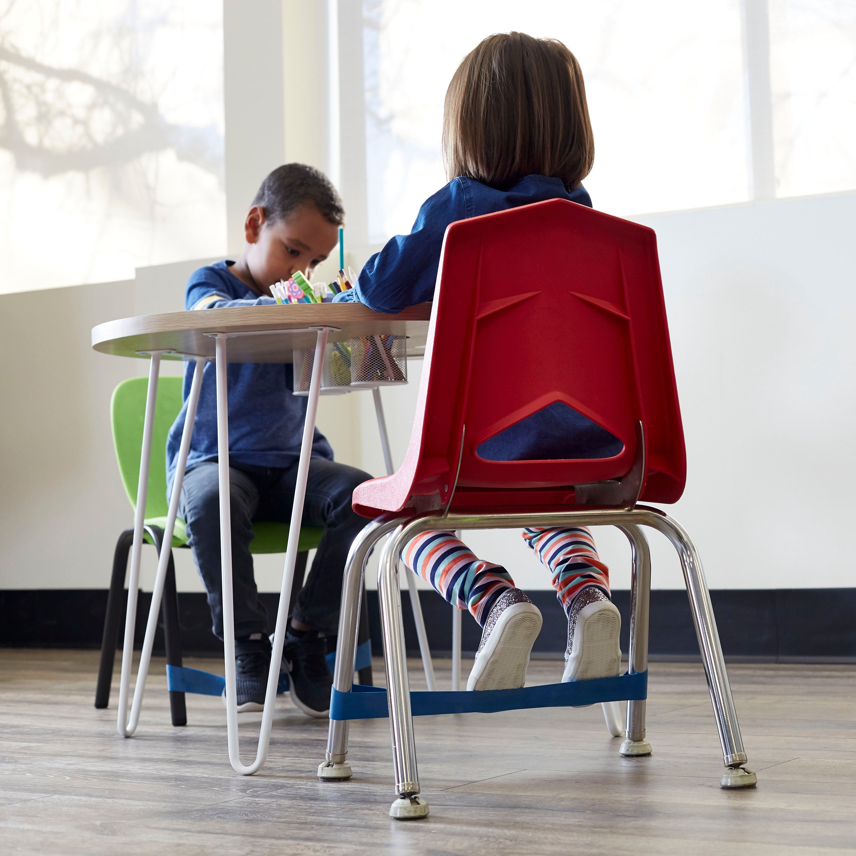 Fidgety kids now have an easy outlet for their daily wiggles when sitting at school or home. Our durable Kids Chair Bands slide up around the front two legs of most standard chairs, letting kids bounce their feet as they sit to help relieve hyperactivity, boredom, or anxiety. Giving kids a way to channel their energy also helps them increase their mental focus for tasks, schoolwork, or homework. Bands come in packs of two.